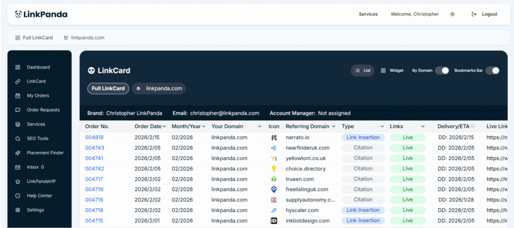 Example: An order with Order No. 004599 may contain five individual backlinks. Each of those links has its own link status in the LinkCard. Some may already be Live while others are still Processing, depending on when each placement was completed. The order itself will only reach Delivered status once all links within it have been placed.